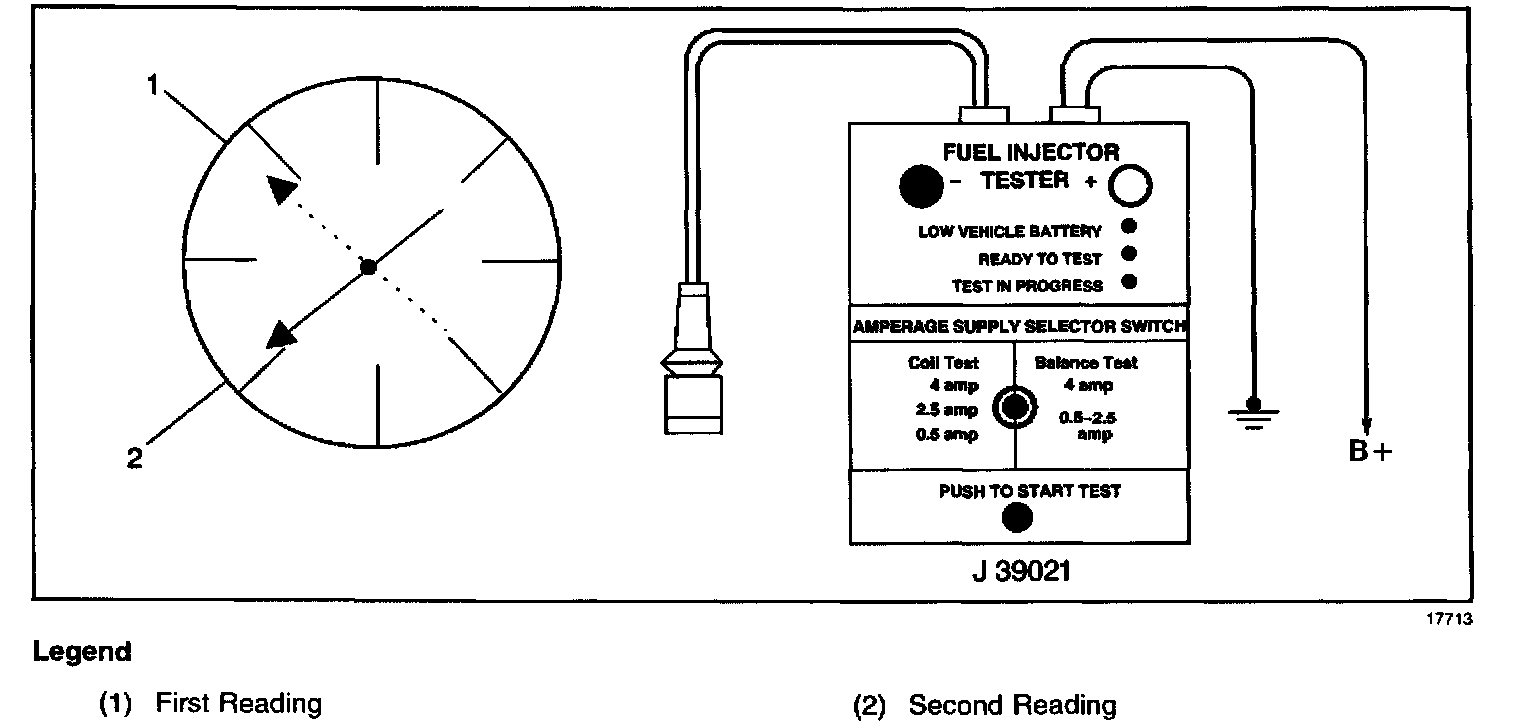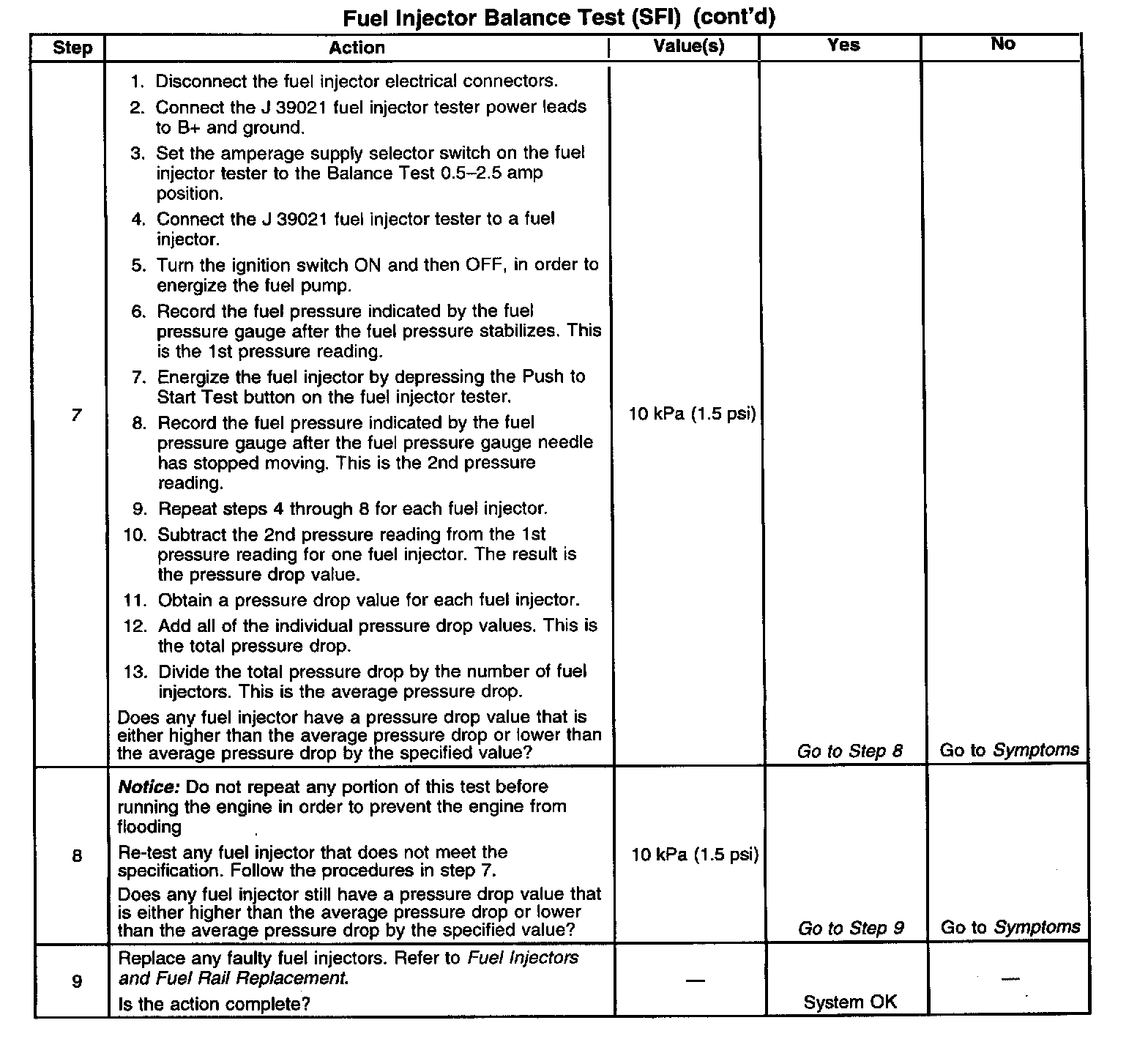 7. The fuel injectors are flowing properly if the pressure drop value for each fuel injector is within 10 kPa (1.5 psi) of the average pressure drop value. Calculate the pressure drop value for each fuel injector by subtracting the second pressure reading from the first pressure reading. Refer to the examples in the preceding table.