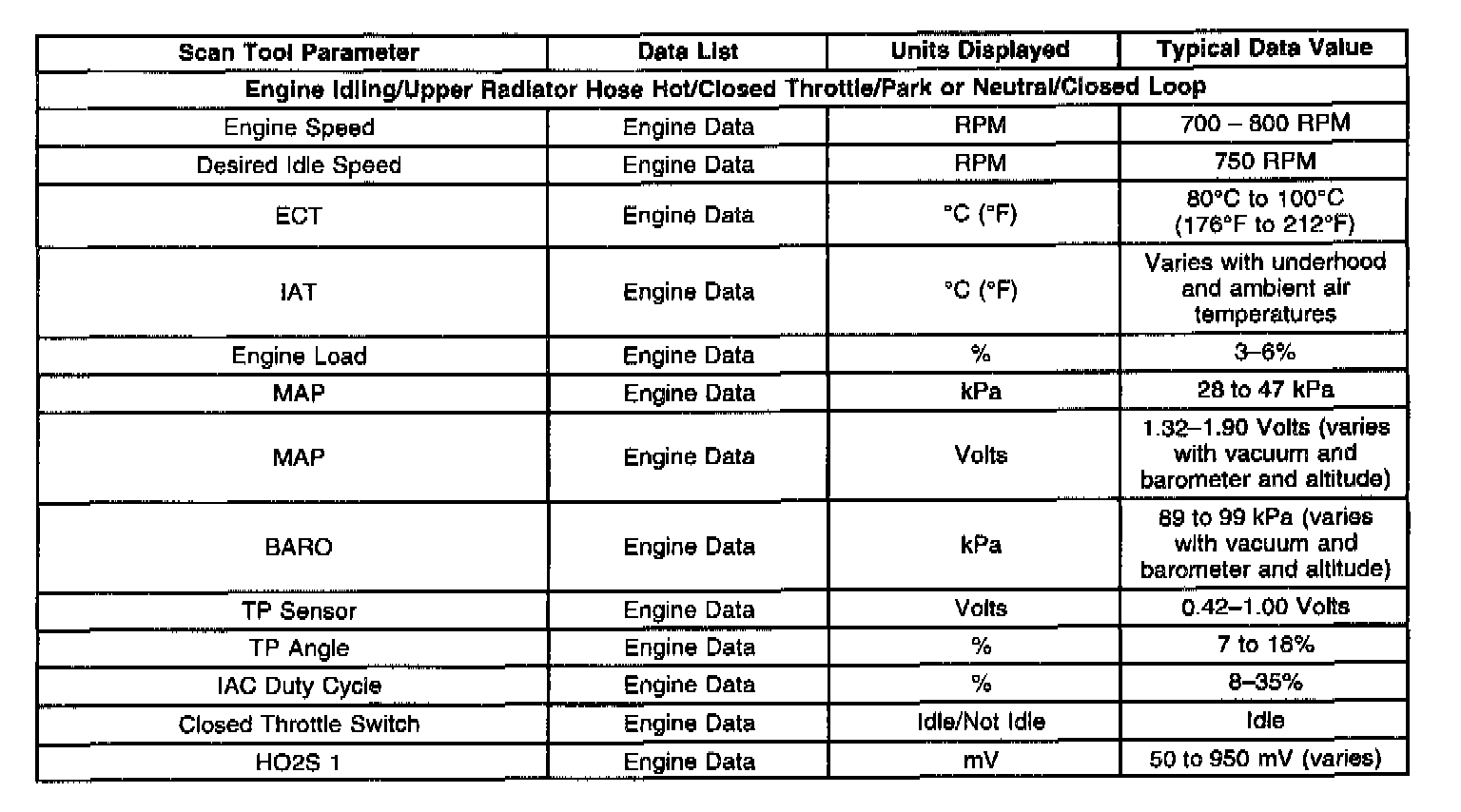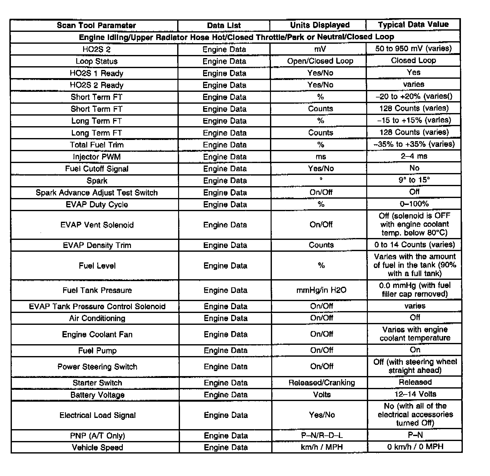 The Engine Scan Tool Data List contains all engine related parameters that are available on the scan tool. The list is arranged in the order shown on the scan tool.
