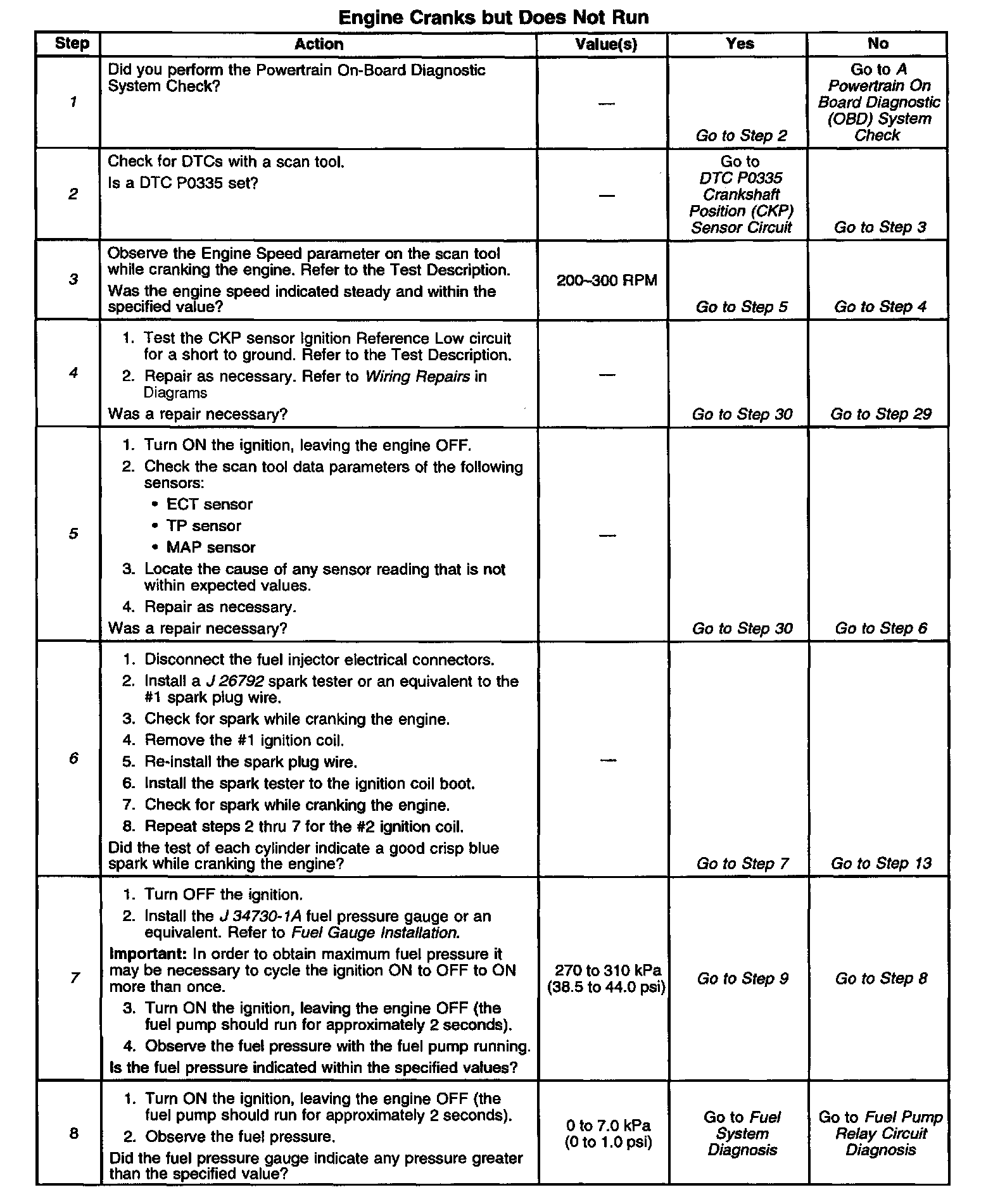 5. This step checks the TP sensor, the ECT sensor, and the MAP sensor for a faulty signal. A faulty sensor input to the PCM may cause a fueling condition that results in a no start.