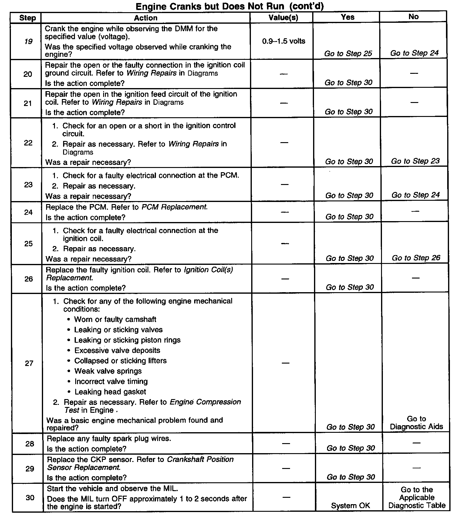 19. This step checks for an ignition signal from the PCM while cranking the engine. The PCM sends a fluctuating voltage to the ignition coils after determining the engine speed from the CKP sensor.