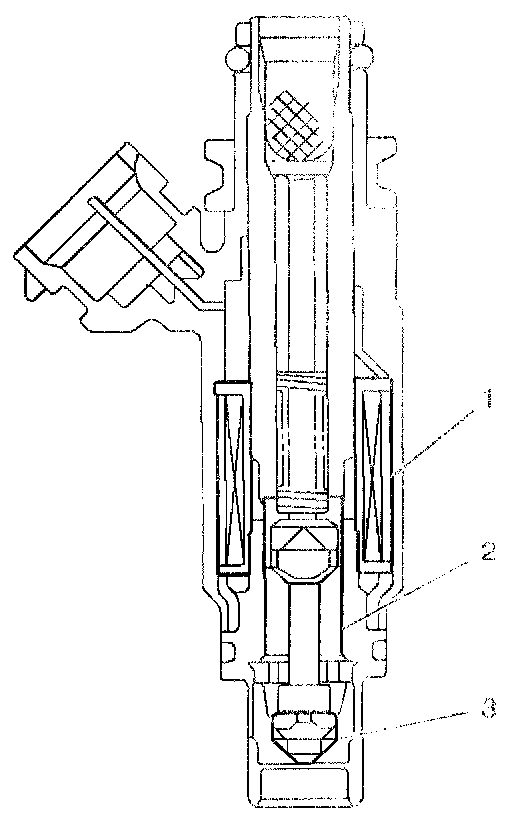 The powertrain control module energizes the solenoid coil (1) of the fuel injector, generating an electromagnet field that attracts the solenoid plunger (2). The ball valve (3), which is incorporated with the solenoid plunger, is opened by the movement of the solenoid plunger. The opening of the ball valve allows fuel that is under pressure to disperse in a cone shaped (conic) pattern. Because the stroke of the ball valve in the fuel injector is set constant, the amount of fuel injected at one time is determined by the length of time the solenoid coil is energized (pulse width injection time).