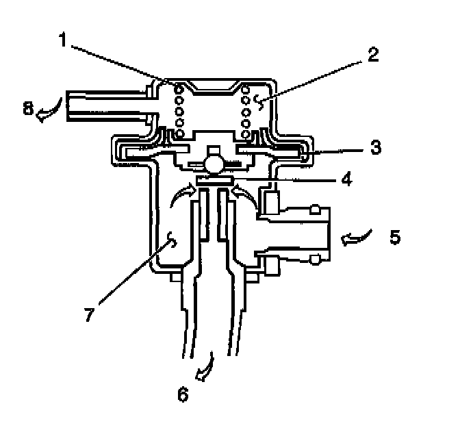 The fuel pressure regulator is a diaphragm-operated pressure relief valve consisting of a diaphragm (3), a spring (1), and a valve (4). The fuel pressure regulator keeps the fuel pressure applied to the fuel injector at a pressure 290 kPa (41 psi) greater than the pressure in the intake manifold.