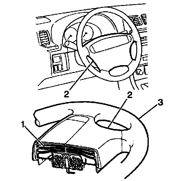 The inflator modules consist of an inflatable bag (1) and an inflator (4) (a canister of gas-generating material and an initiating device). These components are concealed behind a trim vinyl cover (2), positioned in the center of the steering wheel (3).