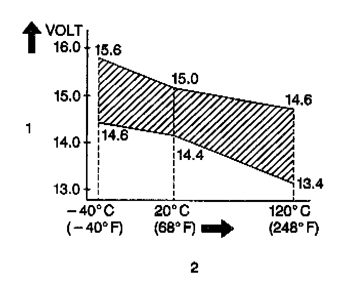 5. With all accessories turned off, connect a J 39200 across the battery. Run the engine at a moderate speed and check the voltage, taking into account the temperature that the generator is exposed to during the test. As the temperature of the regulator case (2) in the generator increases, the voltage output (1) will decrease. The standard regulator voltage setting is 14.4 to 15.0 volts at 20°C (68°F). The minimum operating voltage should be 13.5 volts. If the voltage is at 13.5 volts or more, proceed to the next step. If the voltage is less than 13.5 volts, repair or replace the generator. Refer to Generator Overhaul or Generator Replacement.