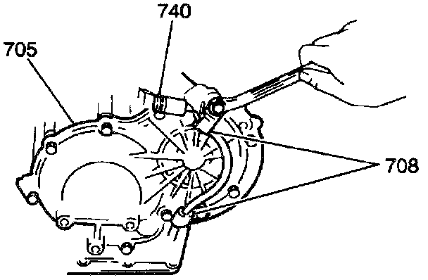 4. Remove the five bolts from the rear case cover (705). Remove the two brackets (708) from the solenoid wiring harness (740).