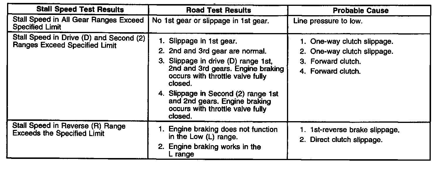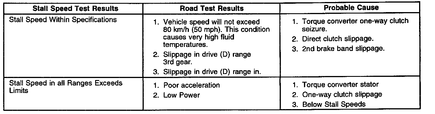 The stall speed should fall within 2000 - 2500 RPM in all tested gear ranges. Refer to the Stall Speed Test Diagnosis for causes of higher or lower stall speed.