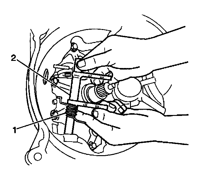2. Remove the clutch release shaft return spring (1) from the clutch release shaft fork (2).