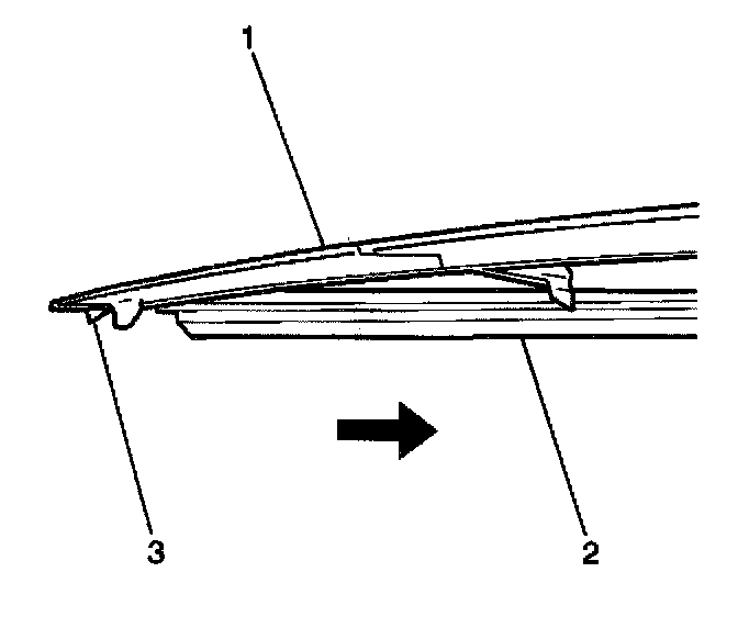 1. Lift the tip of the wiper blade rubber (2) in order to clear the retaining tab (3).