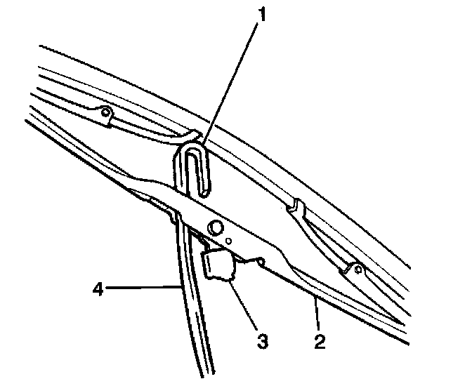 2. Slide the blade assembly (2) down the wiper arm (4) until the blade clears the wiper arm hook (1).