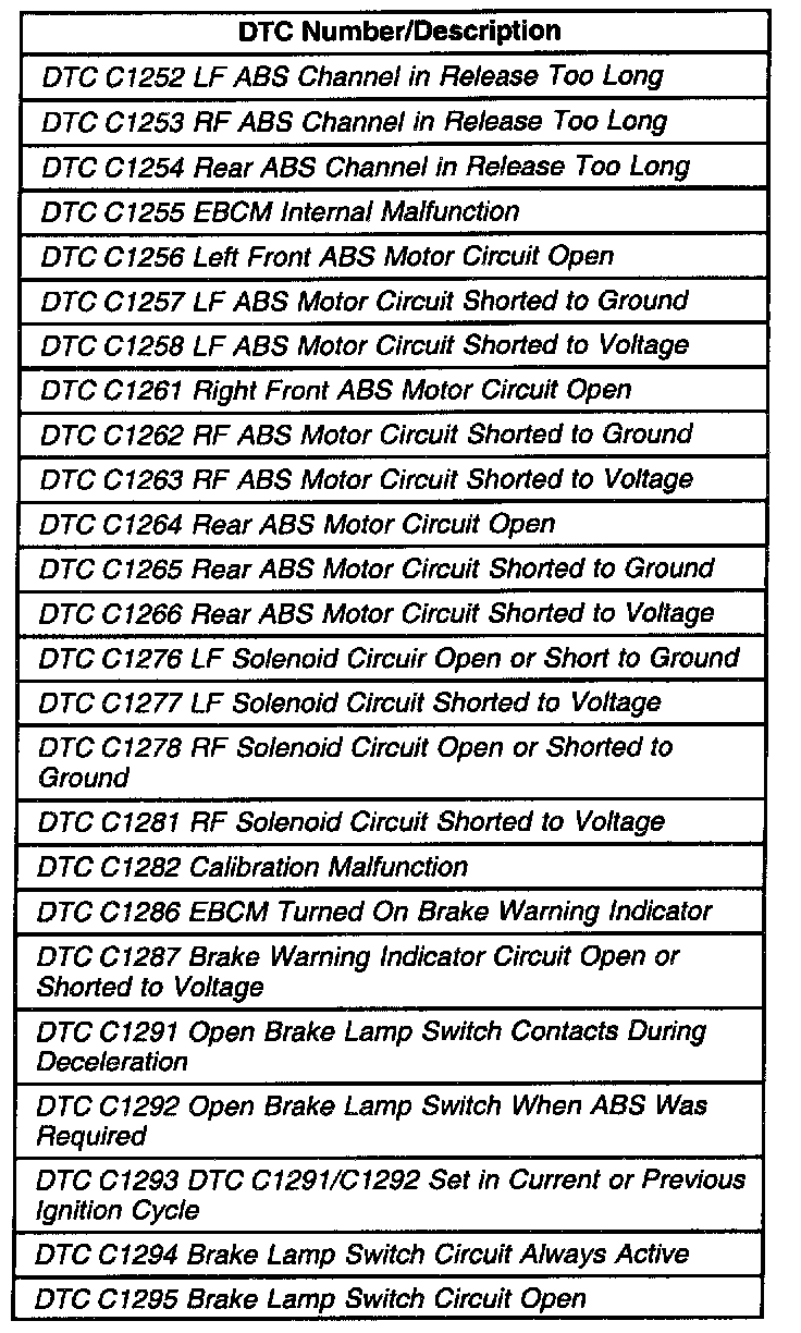 These are the only ABS diagnostic trouble codes for this vehicle additional ABS diagnostic trouble codes obtained with an aftermarket scan tool are not valid ABS trouble codes. Contact the aftermarket scan tool manufacture for additional assistance.