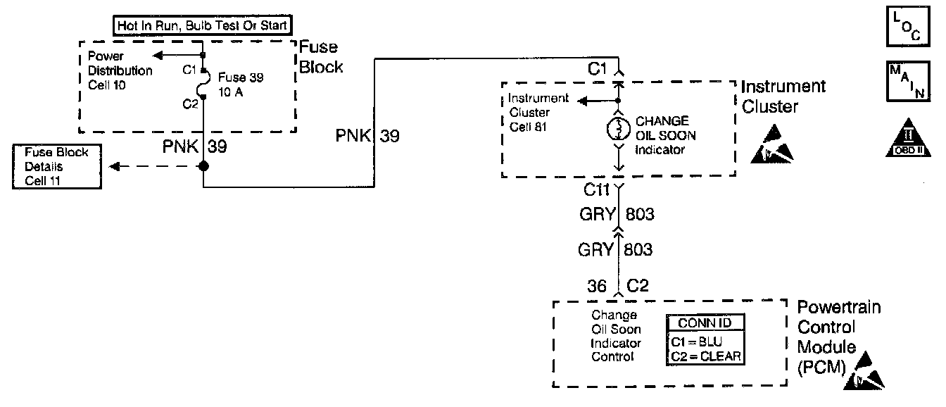 Output Driver Modules (ODMs) are used by the PCM to turn on many of the current-driven devices that are needed to control various engine and Transaxle functions. Each ODM is capable of controlling up to 7 separate outputs by applying ground to the device which the PCM is commanding on. The Change Oil Soon indicator is powered through a 10 Amp fuse in the fuse block. The PCM turns on indicator by supplying a path to ground through the PCM.