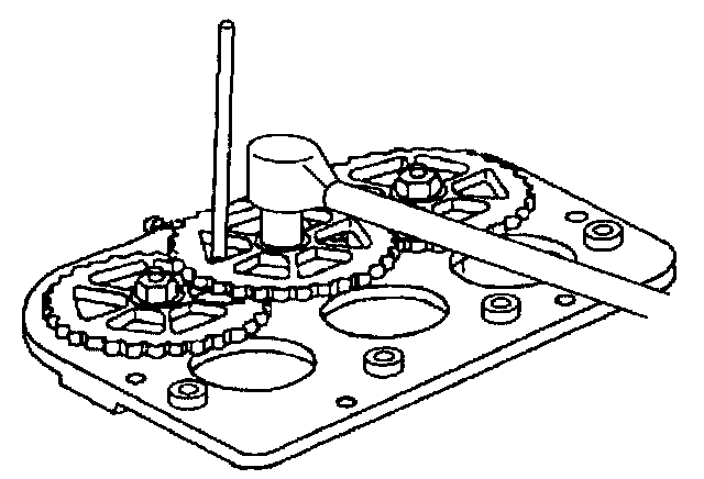 NOTICE: Do not allow gear to turn while removing the retaining nut, since the modulator piston can hit the top of the modulator bore, damaging the piston. Place a screwdriver through the holes in the gears (not between the gears) into the recessed hole in the modulator base. This will prevent the gear from turning, aiding in gear removal.