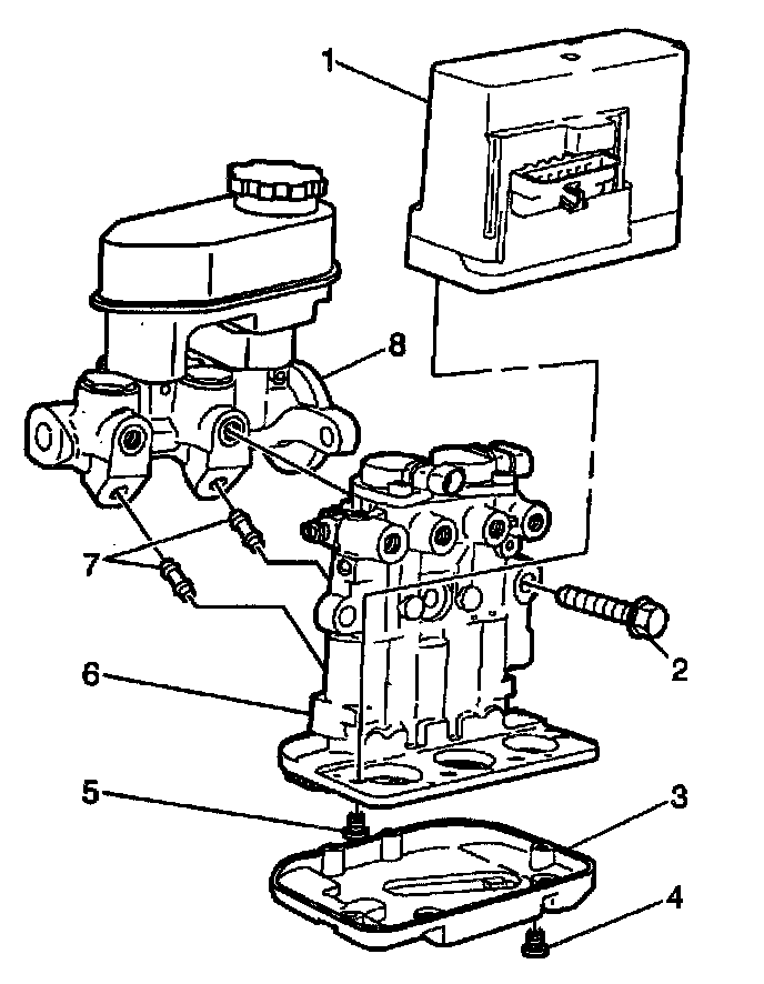 4. Use the following procedure in order to install the ABS brake modulator (6) onto the master cylinder (8):