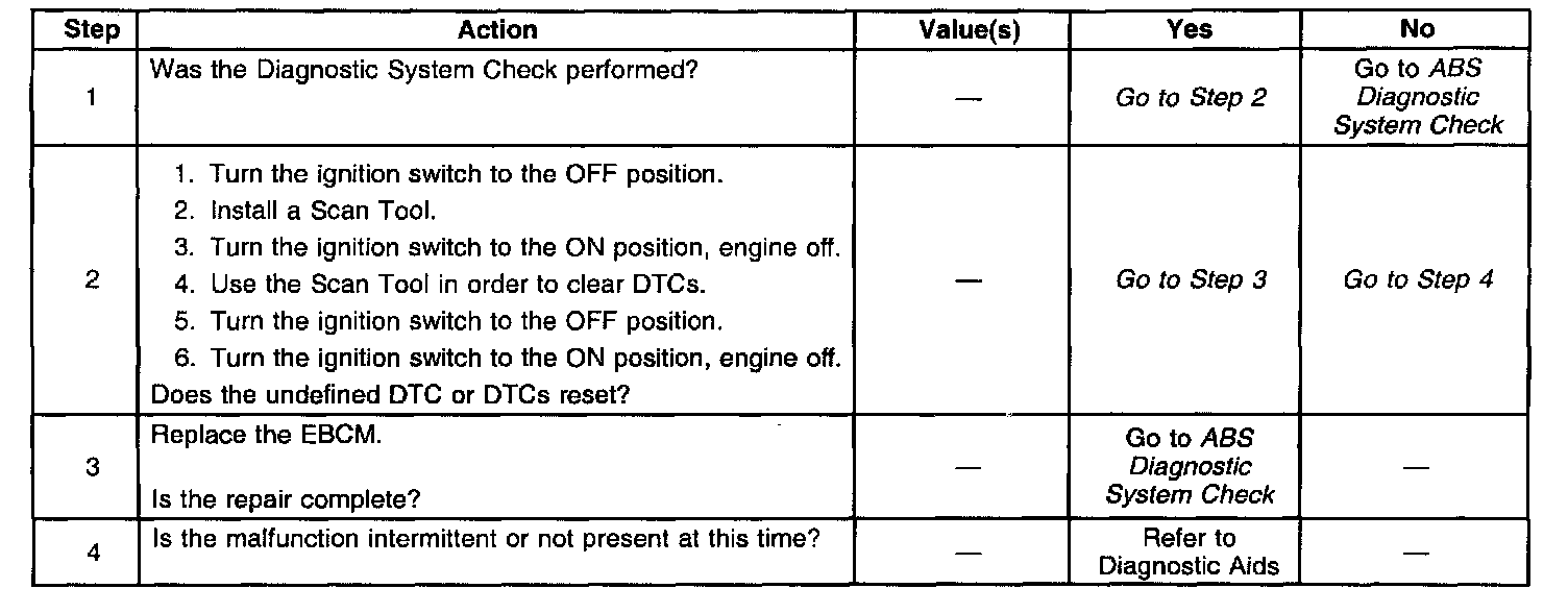 This symptom table identifies undefined DTCs which are caused by an internal malfunction in the EBCM.