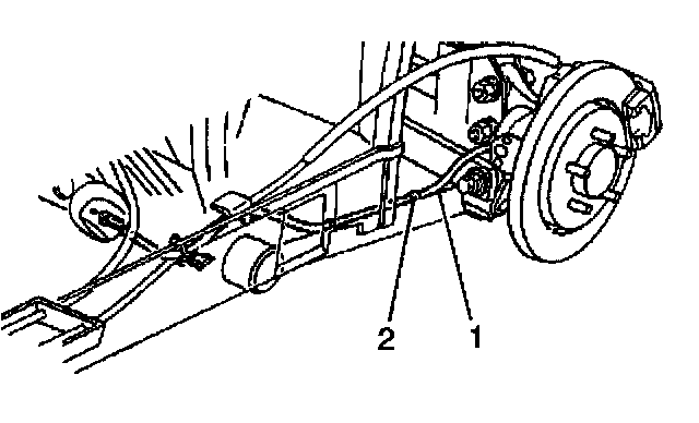1. Connect the rear wheel speed sensor jumper harness connector (1) to the wheel speed sensor, located next to rear strut (2).