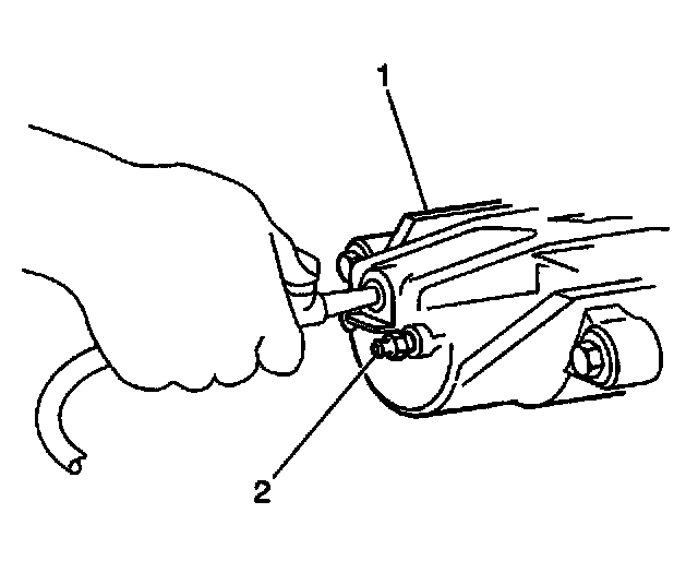 13. Remove the bleeder valve cap (1) and the bleeder valve (2) from the caliper housing (3).