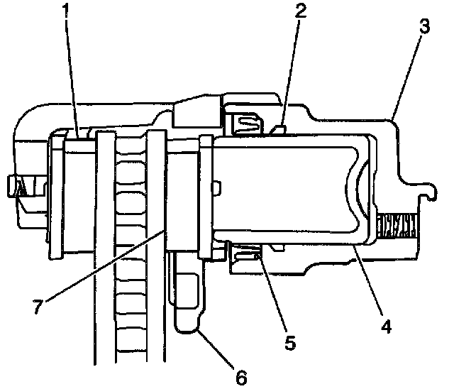 1. Install the caliper housing (1) over the rotor and the caliper bracket (2). Ensure that the bushings are in place.