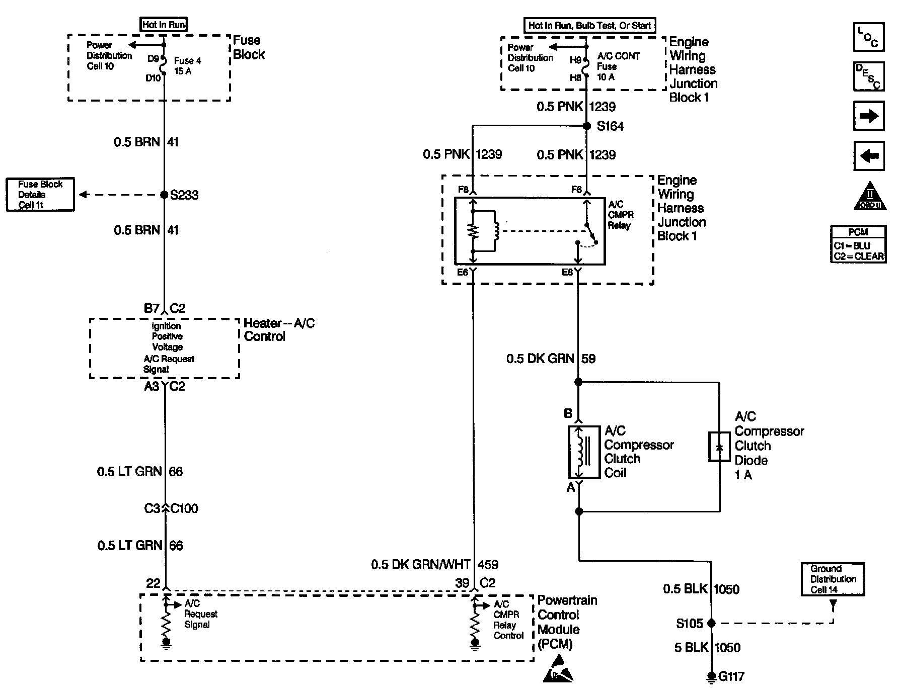 When A/C is selected through the A/C control head a 12.0 volt signal is supplied to the A/C request input of the PCM. The A/C compressor clutch relay is controlled through the PCM. The PCM monitors the A/C refrigerant pressure. If the A/C refrigerant pressure, and engine operating conditions are within a specific calibrated acceptable ranges the PCM will enable the A/C compressor relay. This is accomplished by providing a ground path for the A/C relay coil within the PCM. When the A/C compressor relay is enabled battery voltage is supplied to the compressor clutch coil.