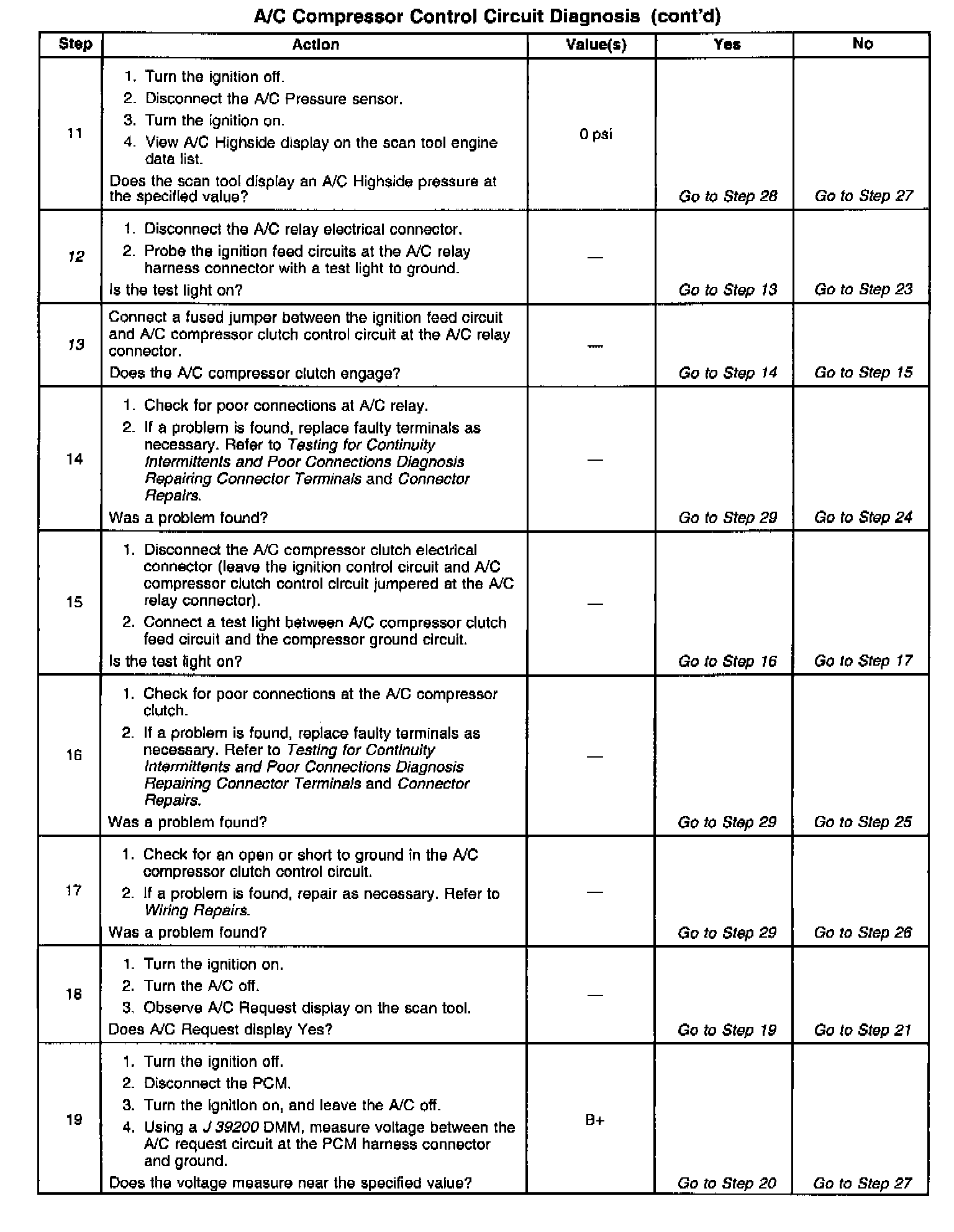2. Stored Diagnostic Trouble Codes (That may not illuminate the Malfunction indicator Lamp) may disable the A/C compressor. This Diagnostic Table may lead to improper diagnosis and replacement of good parts if Diagnostic Trouble Codes are present.