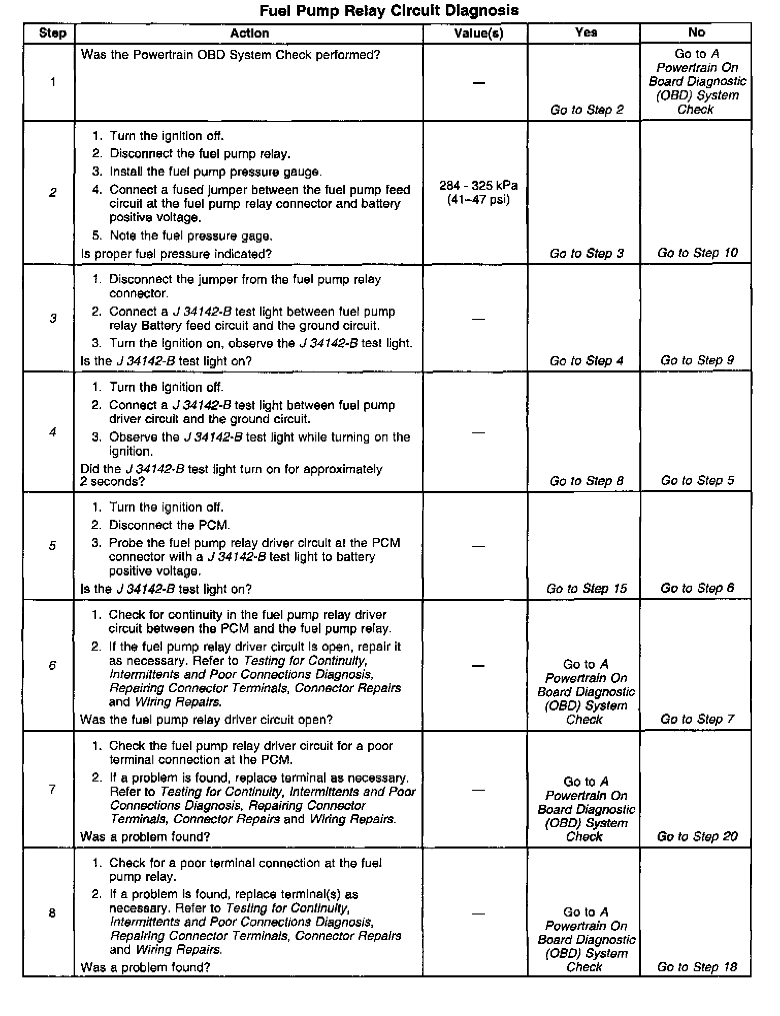 10. If the fuel pump is operating but incorrect pressure is noted, the fuel pump wiring is OK and Fuel System Pressure Test should be used for diagnosis.