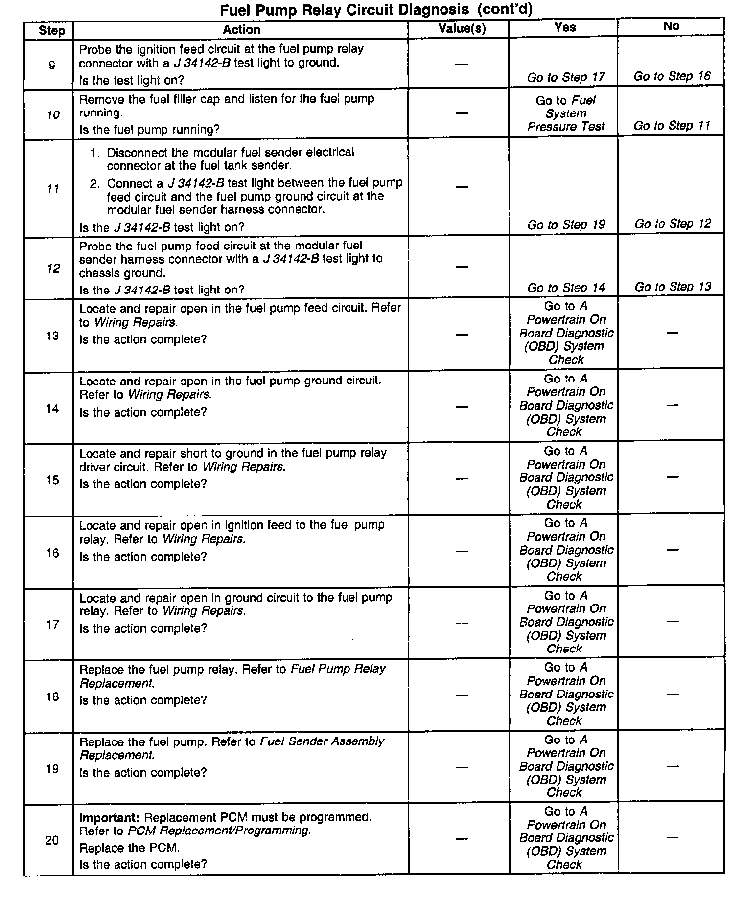 11. Checks the fuel pump feed circuit between the fuel pump relay and the fuel pump. Also checks the fuel pump ground circuit (This circuit has a short pigtail from the fuel module to the harness across the top of the tank).