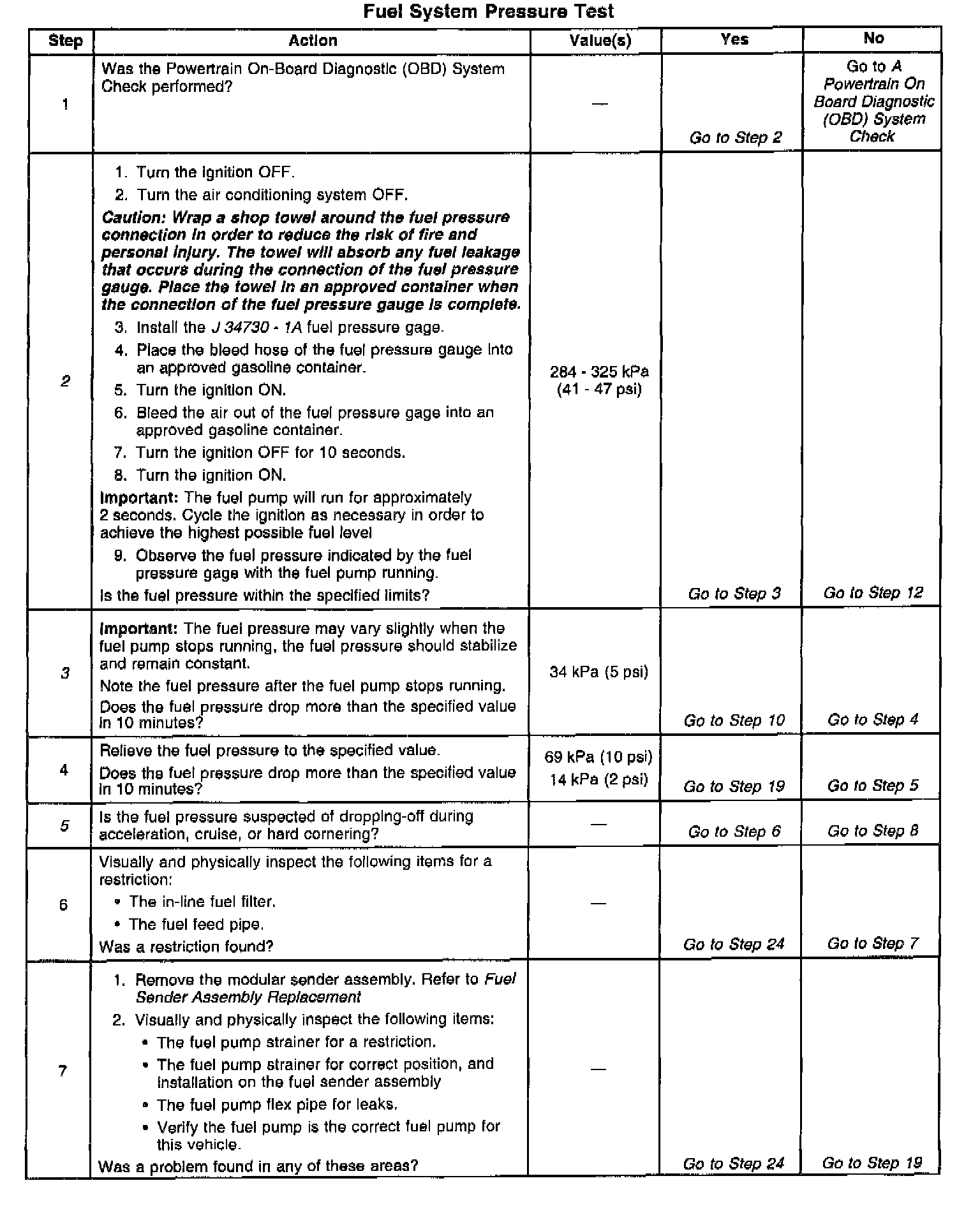 15. A lean condition may result from the fuel pressure being below 284 kPa (41 psi). A lean condition may cause a DTC P0131 or a DTC P0171 to set. Driveability conditions associated with lean conditions can include hard starting (when the engine is cold), hesitation, poor driveability, lack of power, surging, and misfiring.