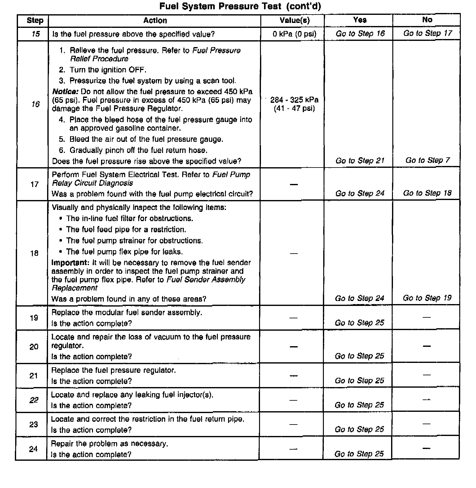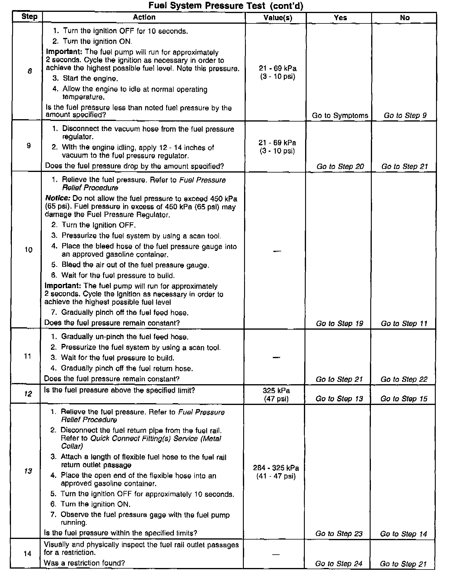 13. This test determines if the high fuel pressure is due to a restricted fuel return pipe or if the high fuel pressure is due to a faulty fuel pressure regulator.