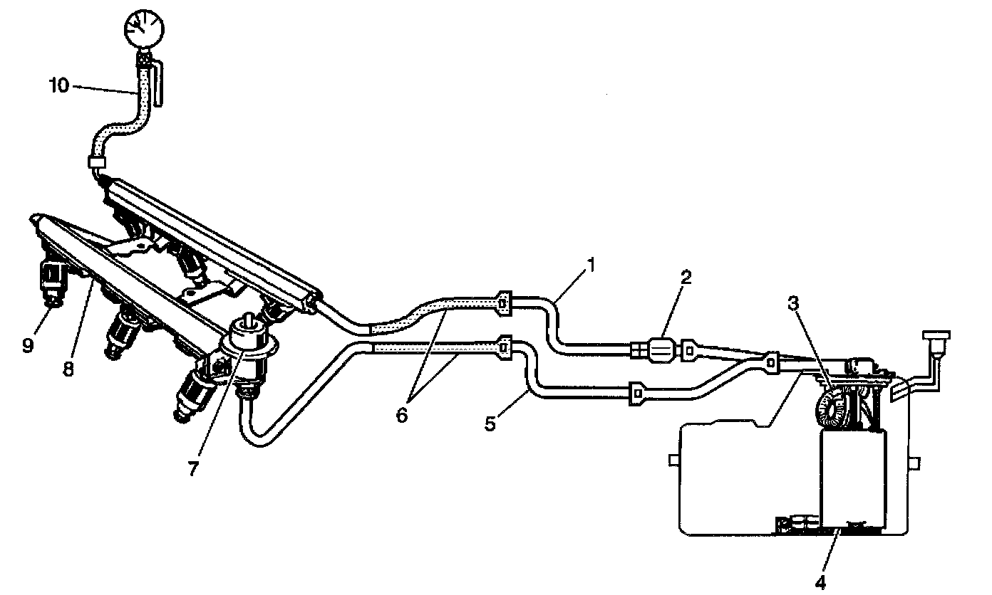 When the ignition switch is turned ON, the Powertrain Control Module (PCM) will turn ON the in-tank fuel pump. The in-tank fuel pump will remain ON as long as the engine is cranking or running and the PCM is receiving reference pulses. If there are no reference pulses, the PCM will turn the in-tank fuel pump OFF 2 seconds after the ignition switch is turned ON or 2 seconds after the engine stops running. The in-tank fuel pump is an electric pump within an integral reservoir (4). The in-tank fuel pump supplies fuel through the fuel feed pipe (1), and in-line fuel filter (2) to the Fuel Rail Assembly (8). The fuel pump is designed to provide fuel at a pressure above the pressure needed by the fuel injectors (9). A fuel pressure regulator (7), attached to the Fuel Rail, keeps the fuel available to the fuel injectors at a regulated pressure. Unused fuel is returned to the fuel tank by a separate fuel return pipe (5). The fuel pump flex pipe (3) functions as a conduit for transporting pressurized fuel from the fuel pump to the above cover fuel feed pipe. The fuel pump flex pipe also eliminates fuel pump generated pressure pulse noise, and eliminates clamps formerly needed for rubber hoses or nylon pipes. The fuel pressure gauge J34730- 1A (10). The fuel pipe return and feed hose assemblies are the pinch points used during the fuel system pressure test (6).