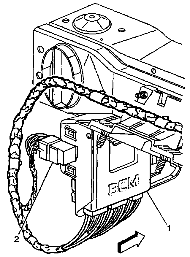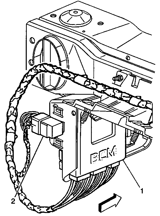 2. Slide the EBCM (1) into the EBCM bracket (2) until pressure tabs secure the EBCM.