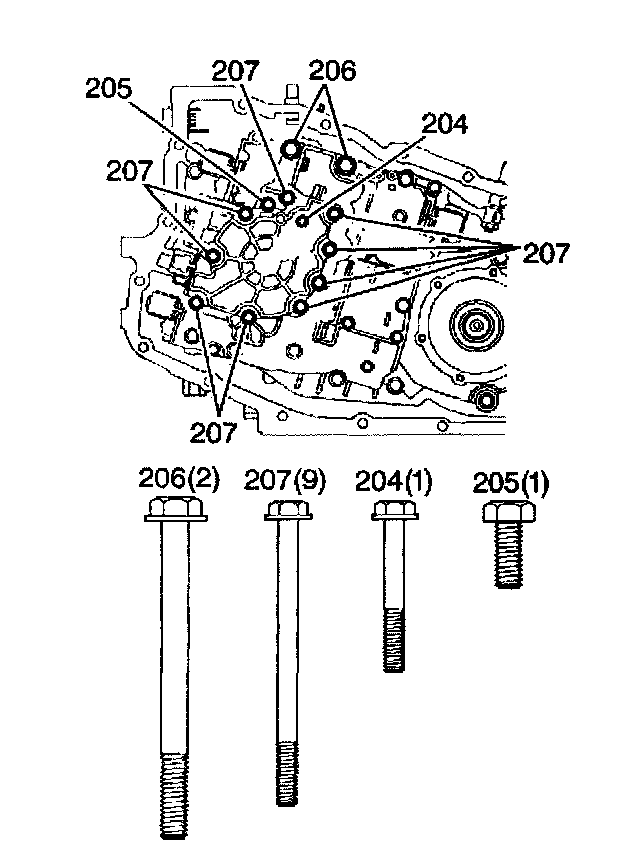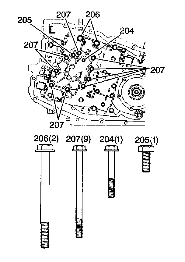 2. Remove the oil pump bolts (204 - 207).