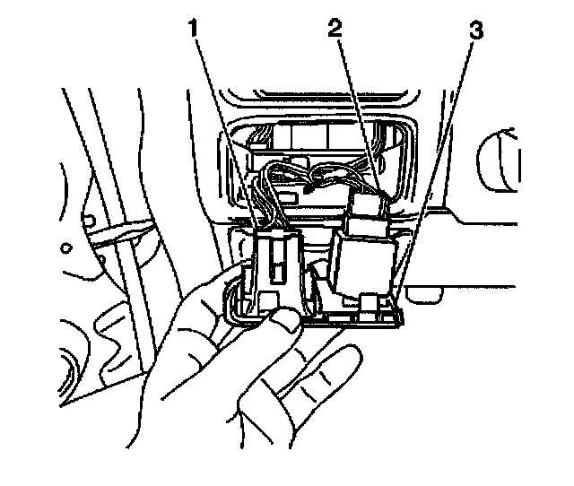 1. Install the outside remote control rearview mirror switch to the lamp dimmer switch/remote control rearview mirror switch trim plate (3). Ensure that the retaining tabs are fully engaged.