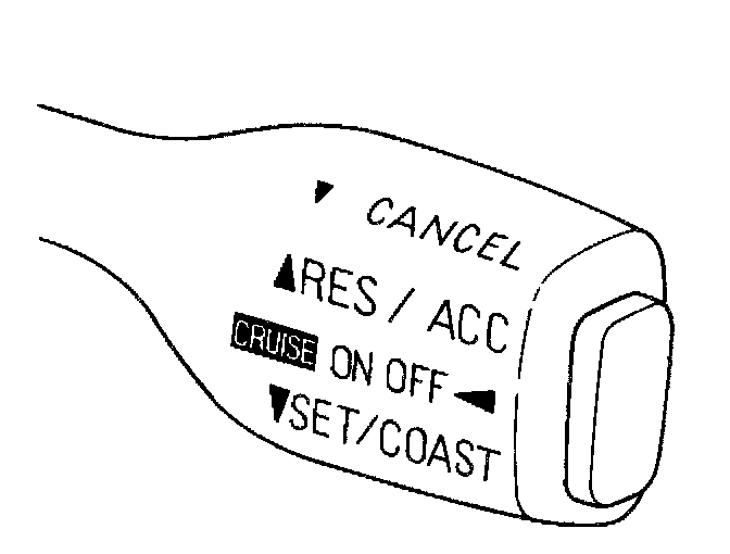 The SET/COAST switch is activated when the cruise control switch is moved downward into the SET/COAST position. When the cruise control switch is moved downward into the SET/COAST position and released, the cruise speed will be set at the speed at which the vehicle was traveling when the switch was activated. In order for this switch to operate, however, the cruise on-off switch button must have been pressed, the CRUISE indicator must be lit, and the vehicle speed must be over 40 km/h (25 mph). The SET/COAST switch can also be used to decrease the cruise speed. By moving the cruise control switch downward into the SET/COAST position and holding it there, the cruise control system will disengage and allow the throttle to return to the idle position. When the new, lower cruise speed has been reached, the cruise control switch is released from the SET/COAST position. Once released, the cruise control system will re-engage and maintain the new desired cruise speed.