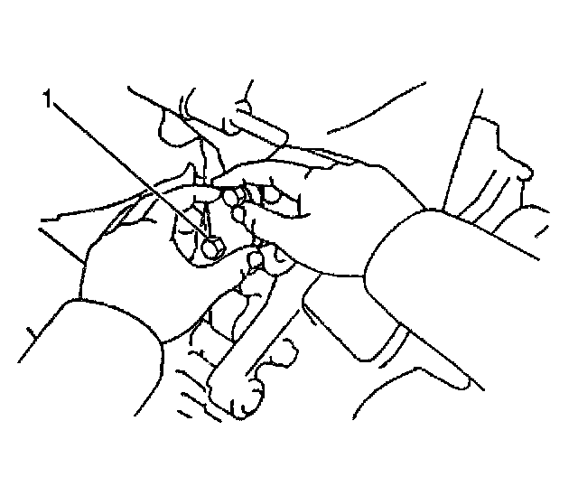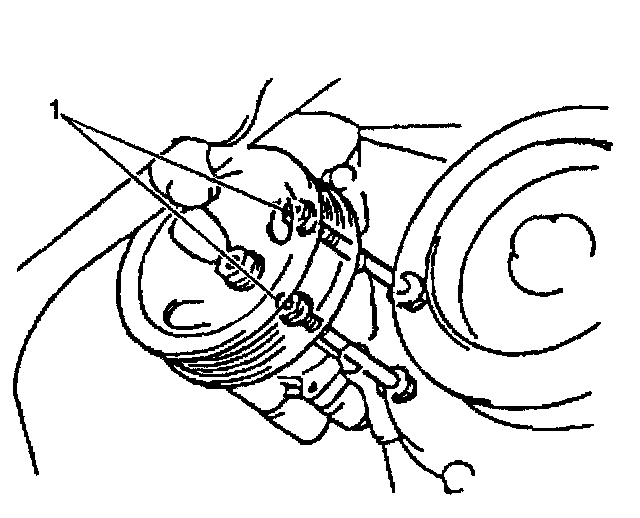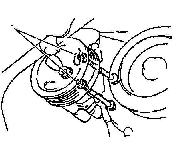 21. Remove the two power steering pump through bolts and the nuts (1).