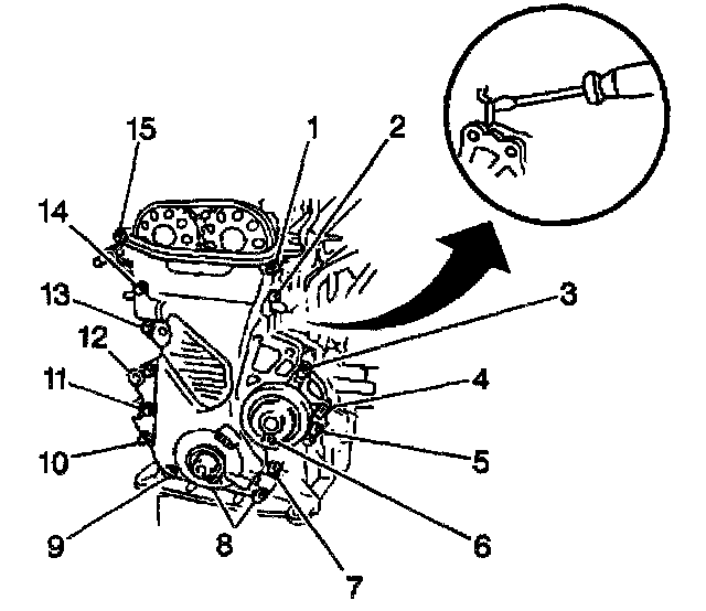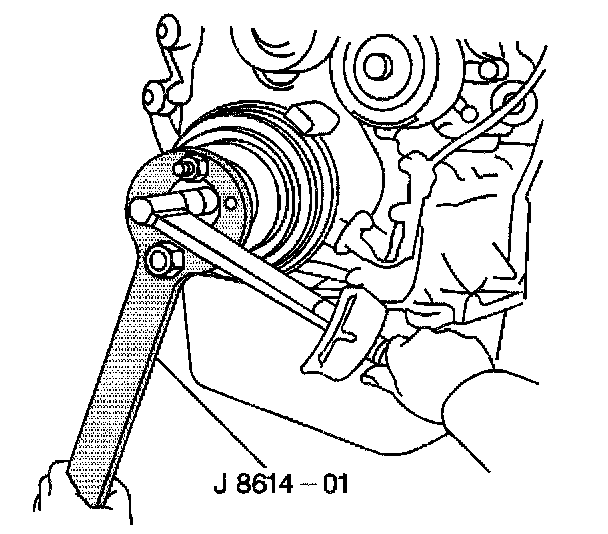 11. Install the crankshaft pulley retaining bolt using J 8614-01 to prevent crankshaft rotation when tightening the bolt.