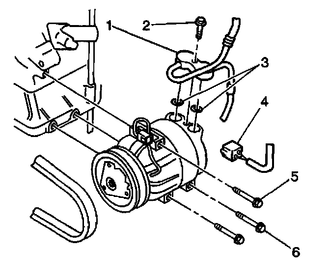 1. Install the compressor to the vehicle. Secure the compressor with the two lower mounting bolts (6).