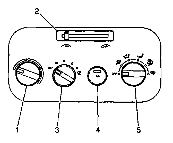The temperature control knob (1) controls the amount of air flow to the heater core, regulating the temperature of the air entering the vehicle. When the temperature control knob is moved completely to the left or full COLD (blue) position, the air mix door closes in order to block the flow of air to the heater core