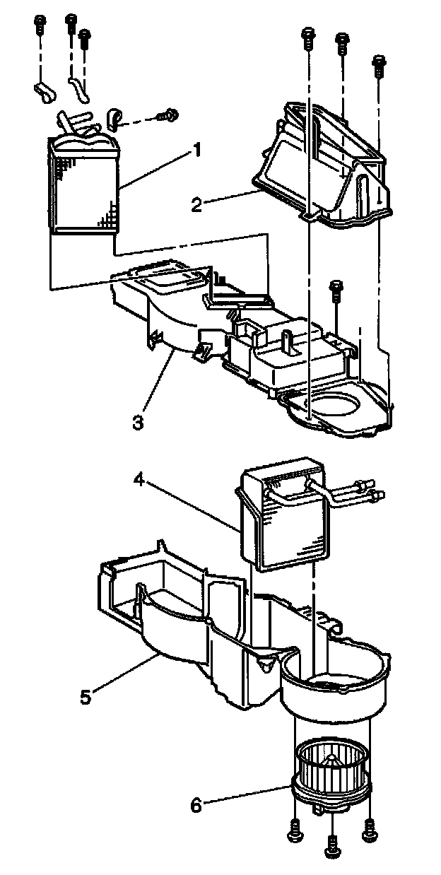 1. Install the evaporator core (4) to the HVAC module assembly.