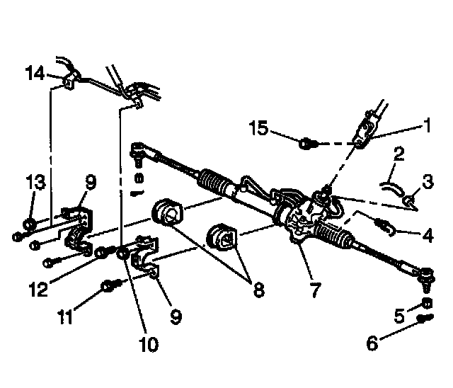 4. Remove the power steering gear outlet front hose (2) from the intermediate outlet pipe (14).