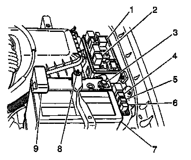 4. Carefully pull fuse and relay block 1 away from the inner fender and unsnap the lower cover.
