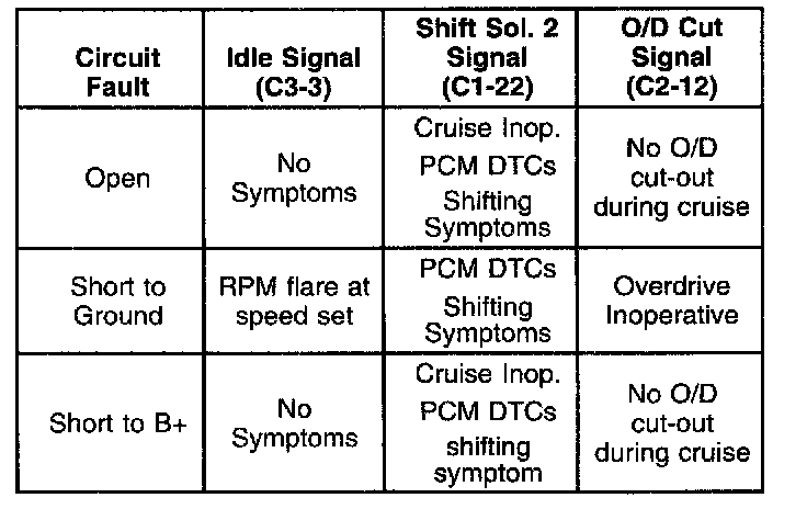 In order to provide adequate cruise control operation the cruise control module receives information from the Powertrain Control Module (PCM). Transmission DTCs may be set by faults in the PCM input circuits or the cruise control module. The following table indicates the PCM circuits and possible symptoms related to a faulty circuit or module.