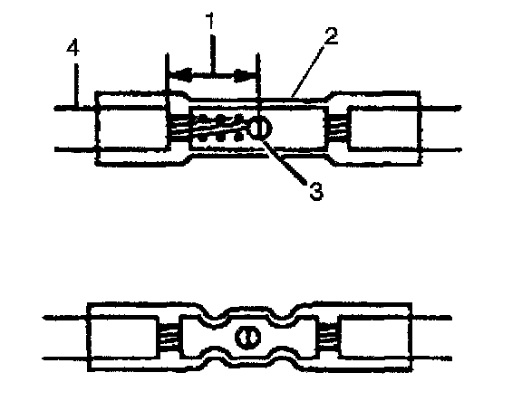 9. Insert the wires into the splice sleeve until the wire hits the barrel stop. The splice sleeve has a stop in the middle of the barrel in order to prevent the wire from passing through the splice (3).