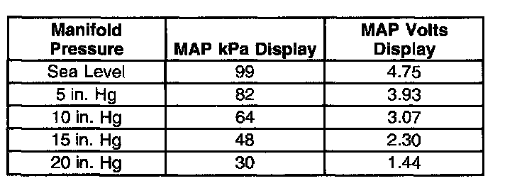 Use the MAP Conversion table in order to view the relationship between manifold pressure (vacuum), MAP sensor kPa and MAP sensor circuit voltage as displayed on the scan tool.
