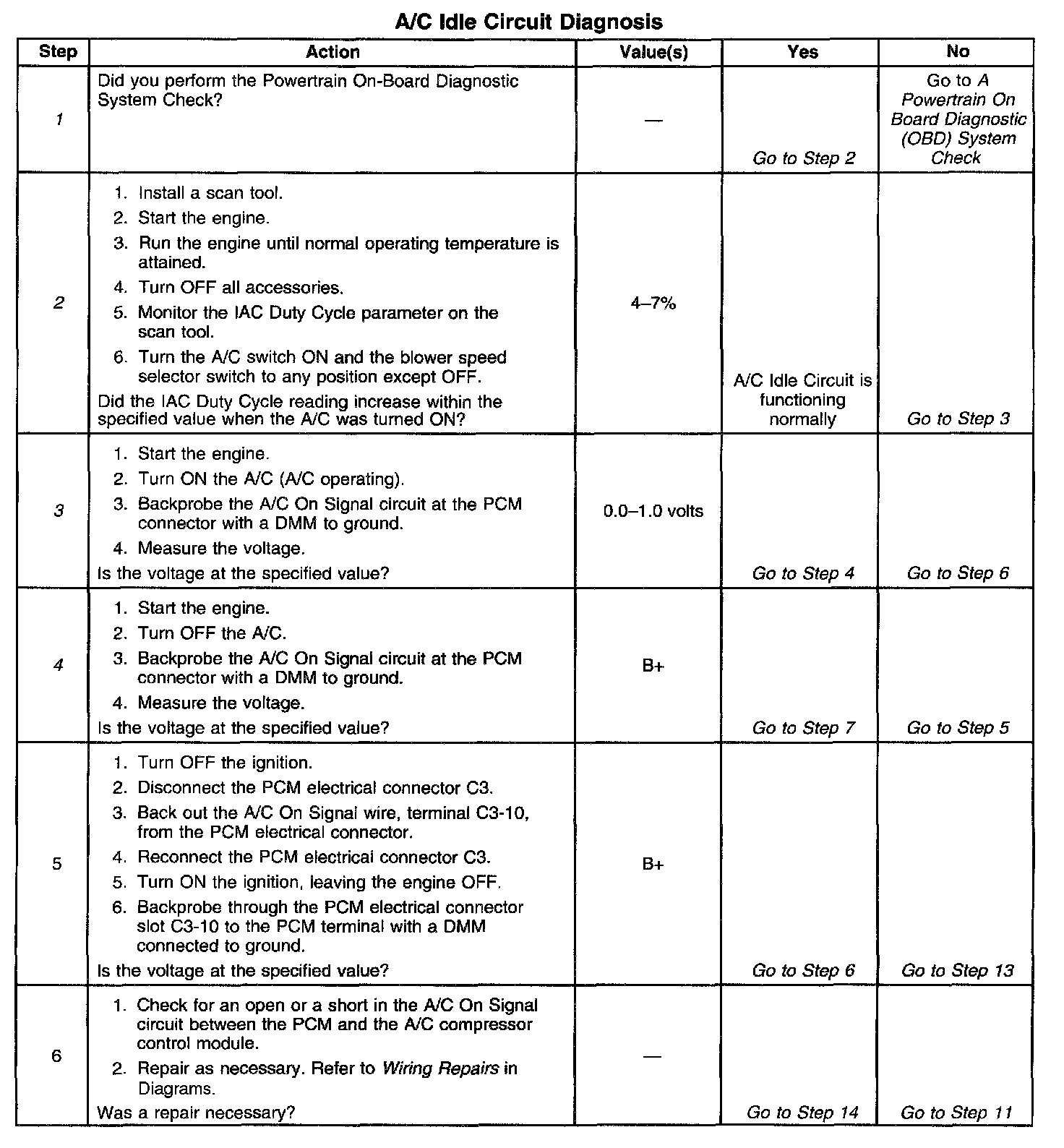 2. This step checks for an increase in the IAC Duty Cycle with the A/C ON. The engine speed should increase 100-200 RPM when the A/C is ON.