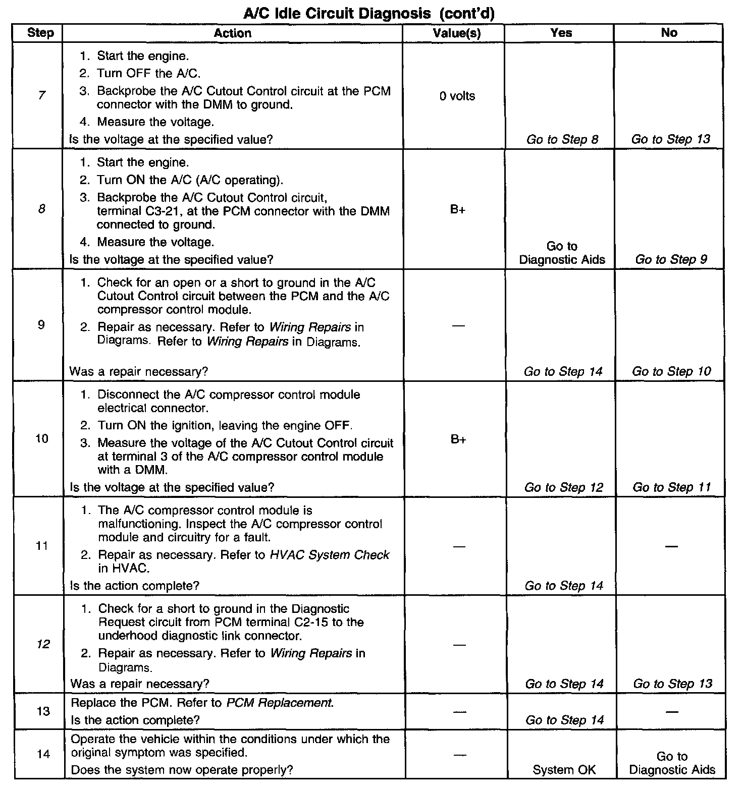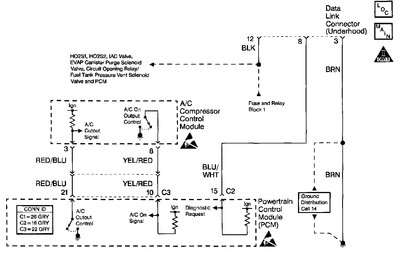 12. This step checks for a short to ground in the Diagnostic Request circuit. A short to ground in the Diagnostic Request circuit can cause the PCM to continually ground the A/C Cutout Control circuit at engine speeds below 1,200 RPM. A short in the Diagnostic Request circuit will prevent the A/C compressor from operating. A short in the Diagnostic Request circuit will also cause the IAC duty cycle and the ignition timing to remain fixed at engine speeds below 1,200 RPM.