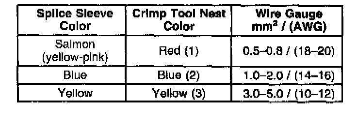 Refer to the table for color coding of the splice sleeves, and the crimp tool nests.