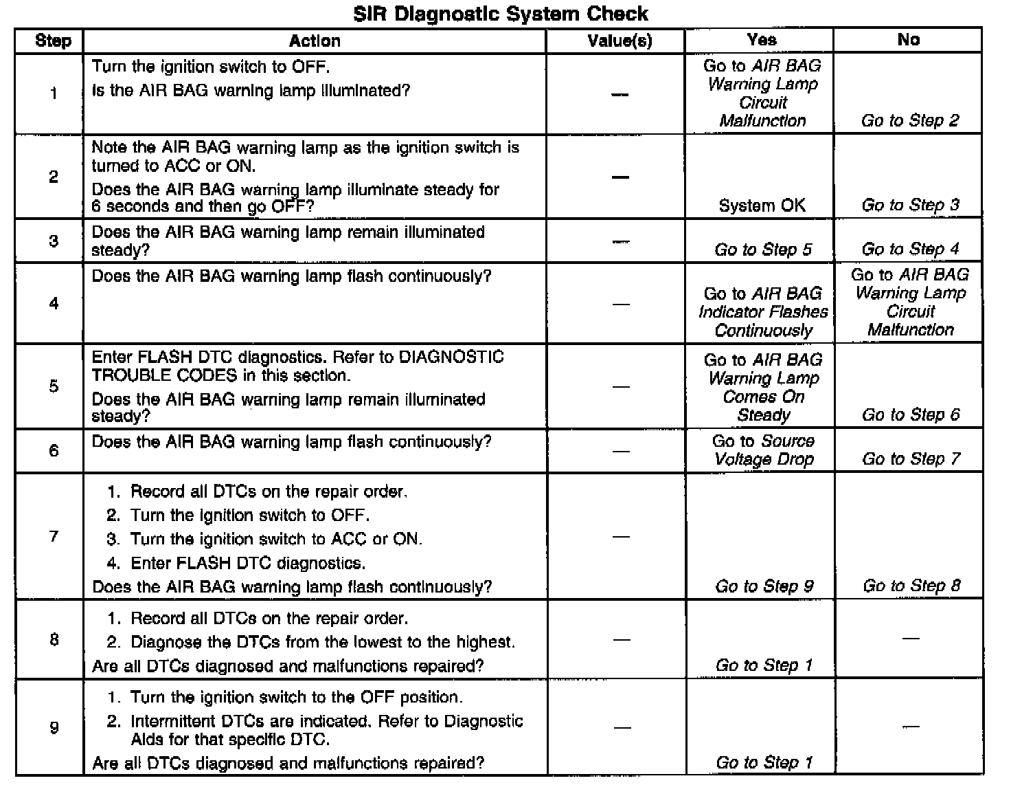 You must diagnose the diagnostic trouble codes in the order specified by the SIR Diagnostic System Check. Failure to do so may result in the following: