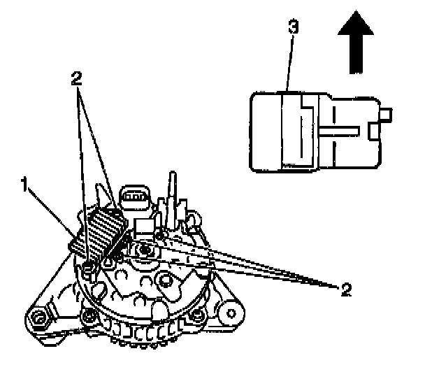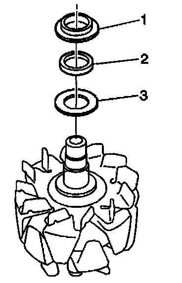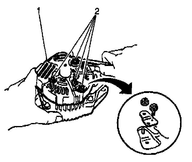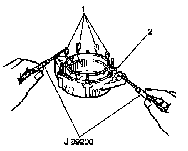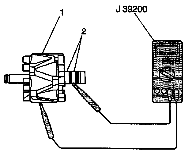 2. Measure the resistance between the rotor slip rings (2) and the rotor (1) with the J 39200. If the resistance is less than 5 ohms, replace the rotor.