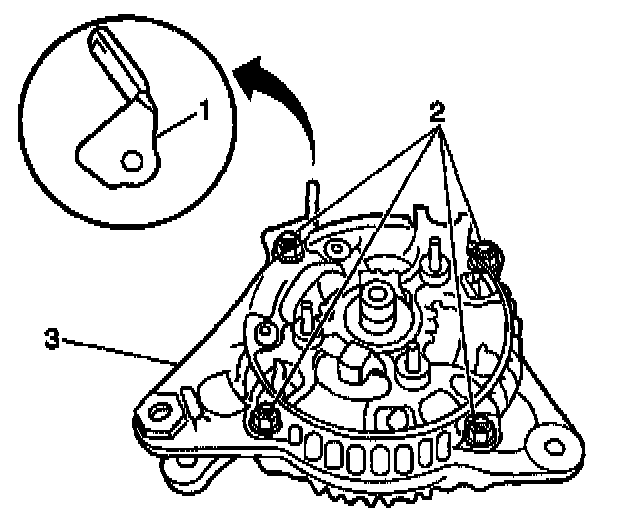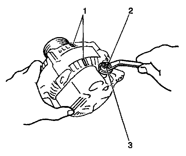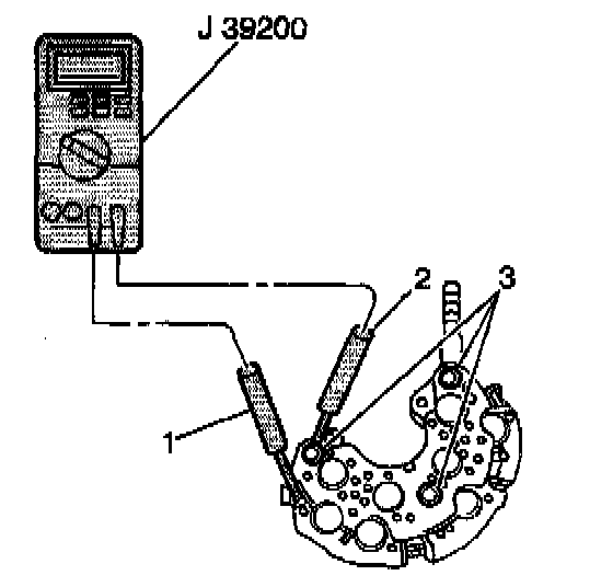 8. Measure the resistance between the rectifier negative terminal (3) and each rectifier terminal with the J 39200. Reverse the probes and measure the resistance again. If the resistance is not less than 5 ohms in one measurement and greater than 5 ohms in the other measurement, replace the rectifier.