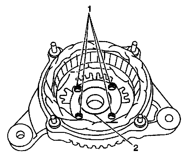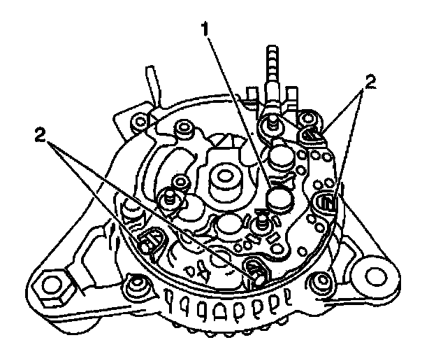 16. Remove the 4 nuts (2) and the clip (1) from the rectifier end frame.