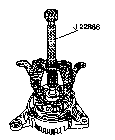 14. Remove the pulley nut using the J 35452 or the J39194-B and a 10 mm socket. Loosen the nut with the 7/8 in box end wrench while holding the rotor shaft with the 10 mm socket wrench.